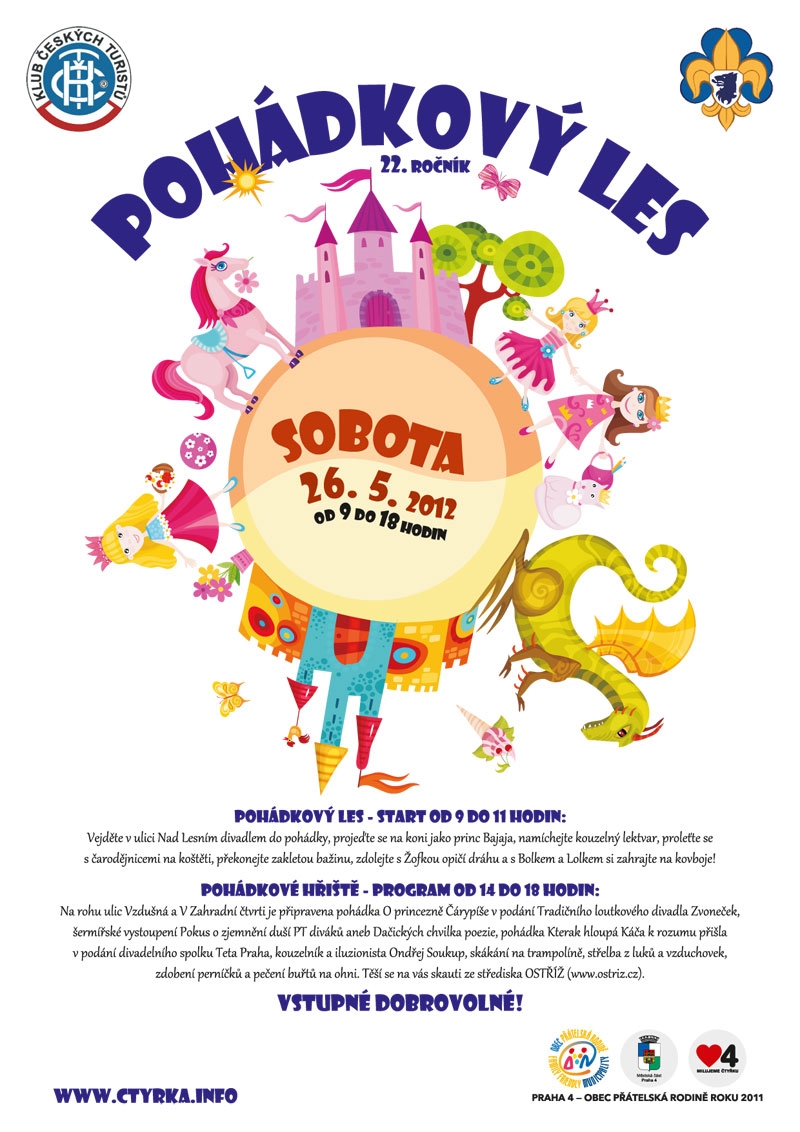| Popis: | Vejděte v ulici Nad Lesním divadlem v Praze 4 do pohádky, projeďte se na koni jako princ Bajaja, namíchejte kouzelný lektvar, proleťte se s čarodějnicemi na koštěti, překonejte zakletou bažinu, zdolejte s Žofkou opičí dráhu a s Bolkem a Lolkem si zahrajte na kovboje! Vstupné dobrovolné. Odpolední program od 14.00 hod. (ulice Vzdušná, V Zahradní čtvrti): pohádka O princezně Čárypíše v podání TLD Zvoneček, šermířské vystoupení Pokus o zjemnění duší PT diváků aneb Dačických chvilka poezie, pohádka Kterak hloupá Káča k rozumu přišla v podání divadelního spolku Teta Praha, kouzelník a iluzionista Ondřej Soukup, skákání na trampolíně, střelba z luků a vzduchovek, zdobení perníčků a pečení buřtů na ohni. 26. 5. 9.00 – 11.00 hod. |