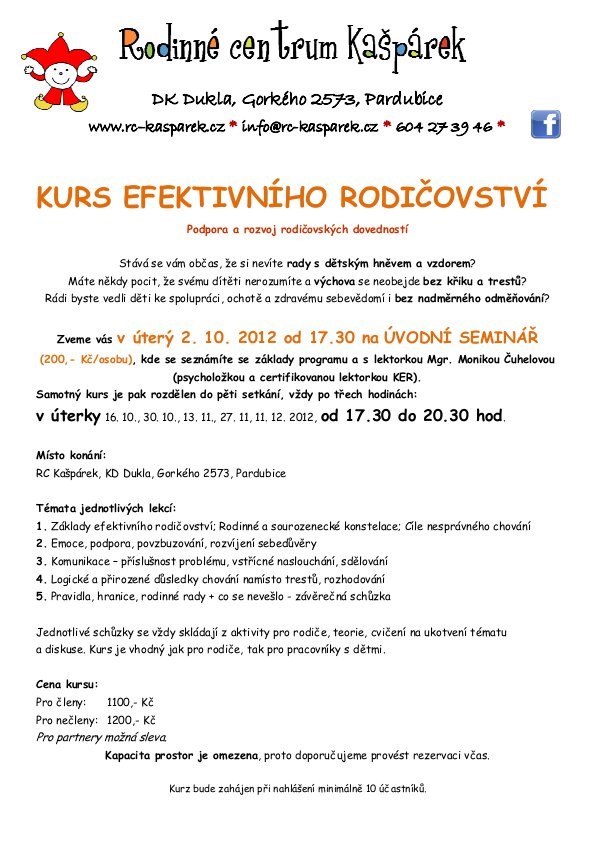 | Popis: | V tom případě v úterý 2. 10. v 17.30 přijďte na úvodní hodinu Kurzu efektivního rodičovství v Kašpárku. Samotný kurs je pak rozdělen do pěti setkání, vždy po třech hodinách: v úterky 16. 10., 30. 10., 13. 11., 27. 11, 11. 12. 2012, od 17.30 do 20.30 hod. Lektorka: Mgr. Monika Čuhelová (psycholožka a certifikovaná lektorka KER, vedoucí RC Krůček Svitavy a matka 3 šťastných dětí). |