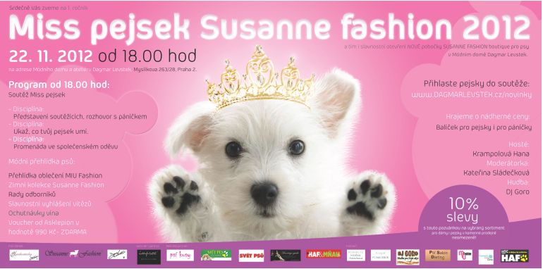 | Popis: | Srdečně Vás zveme na 1. ročník Miss pejsek 2012 a tím i slavnostní otevření NOVÉ pobočky SUSANNE FASHION boutique pro psy v Módním domě Dagmar Levstek. Pozvánka Miss pejsek Dne 22. 11. 2012 Na adrese: Módní dům Dagmar Levstek, Myslíkova 28, Praha 2. Hosté: Krampolová Hana Moderátorka: Kateřina Sládečková Porota : Krampolová Hana, Zuzana Ščučinská (Susanne Fashion), Dagmar Levstek, Opelková Marie (Cosmetic Care Clinic), Pučelíková Martina (Psí salon Darling) Hrajeme o nádherné ceny: Balíček pro pejsky i pro páníčky více na www.dagmarlevstek.cz/novinky Program od 18.00 hod: 18:00 - 18:30hod : 1. Disciplína: Představení soutěžících, rozhovor s páníčkem 18:30 - 19:00hod : 2. Disciplína: Ukaž, co tvůj pejsek umí. 19:00 - 19:15hod : Módní přehlídka psů: Zimní kolekce Susanne Fashion 19:15 - 19:30hod : 3. Disciplína: Promenáda ve společenském oděvu 19:30 - 19:45hod : Rady odborníků 20:00 - 22:00hod : Slavnostní vyhlášení vítězů, volná zábava,ochutnávky vína Pro přihlášení pejsků do soutěže posílejte na email : akce@dagmarlevstek.cz ve tvaru : Jméno, Příjmení majitele a pejska, kontakt tel., jméno pejska, fotka, rozměry - hrudník, záda, krk, váha, věk, oblíbená činnost. Termín uzávěrky je do večera 21. 11. 2012 Podmínky účasti www.dagmarlevstek.cz/novinky Hrajeme o nádherné ceny: Balíček pro pejsky i pro páníčky více na www.dagmarlevstek.cz/novinky Návštěvníci akce, kteří nebudou vybráni mezi 6 soutěžících mohou vyhrát od časopisu Haf a Mňau půl roční předplatné. Stačí, aby Váš pejsek během večera zaujal šéfredaktorku časopisu Kateřinu Kašparovou. V tento den navíc, pro každého: akční ceny na oblečky a doplňky dárek- Voucher na konzultaci na oddělení dermatologie a laserové medicíny s diagnostikou pleti přístrojem Visia Imaging System v hodnotě 990 Kč ZDARMA od kliniky Asklepion poradenství akční voucher na střih pejska časopis Psí kusy pro každého návštěvníka časopis Svět psů pro každého návštěvníka časopis Haf a Mňau psí dobroty od krmení HTC Haf 5% slevy na vybraný sortiment po celý den. Miss pejsek Fotograf: Roman Sláčík |