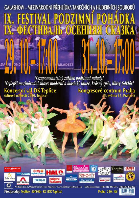 | Popis: | Jíž po deváté Praha bude hostit tolik oblíbený Mezinárodní festival dětí a Mládeže Podzimní pohádka. 29. října 17:00 Dům Kultury Teplice (Mírové náměstí 2950, Teplice) 31. října 17:00 Kongresové centrum Praha (5.května 65, Praha 4) Festival, který je mezinárodní přehlídkou hudebních a tanečních souborů i letos přivítá účinkující z různých států. Série Teplických a Pražských gala- koncertů nabídnou rozmanitou hudební a taneční podívanou, během které vystoupí laureáti festivalů. Diváky čeká originální dějové nápady moderního a klasického tance, krásný sborový zpěv, pestrý líbivý folklor, svérázné a barevné kostýmy. Cena vstupenek a předprodej: Teplice – 50/150 ,- Kč pokladna Dům Kultury Teplice Praha 250,- Kč, předprodej v Ticketpro Akci pořádá Nadační Fond "Mezinárodní Fórum Mládeže" www.children-festivals.com Další informace: +420 222 240 697, +420 605 252 222 |