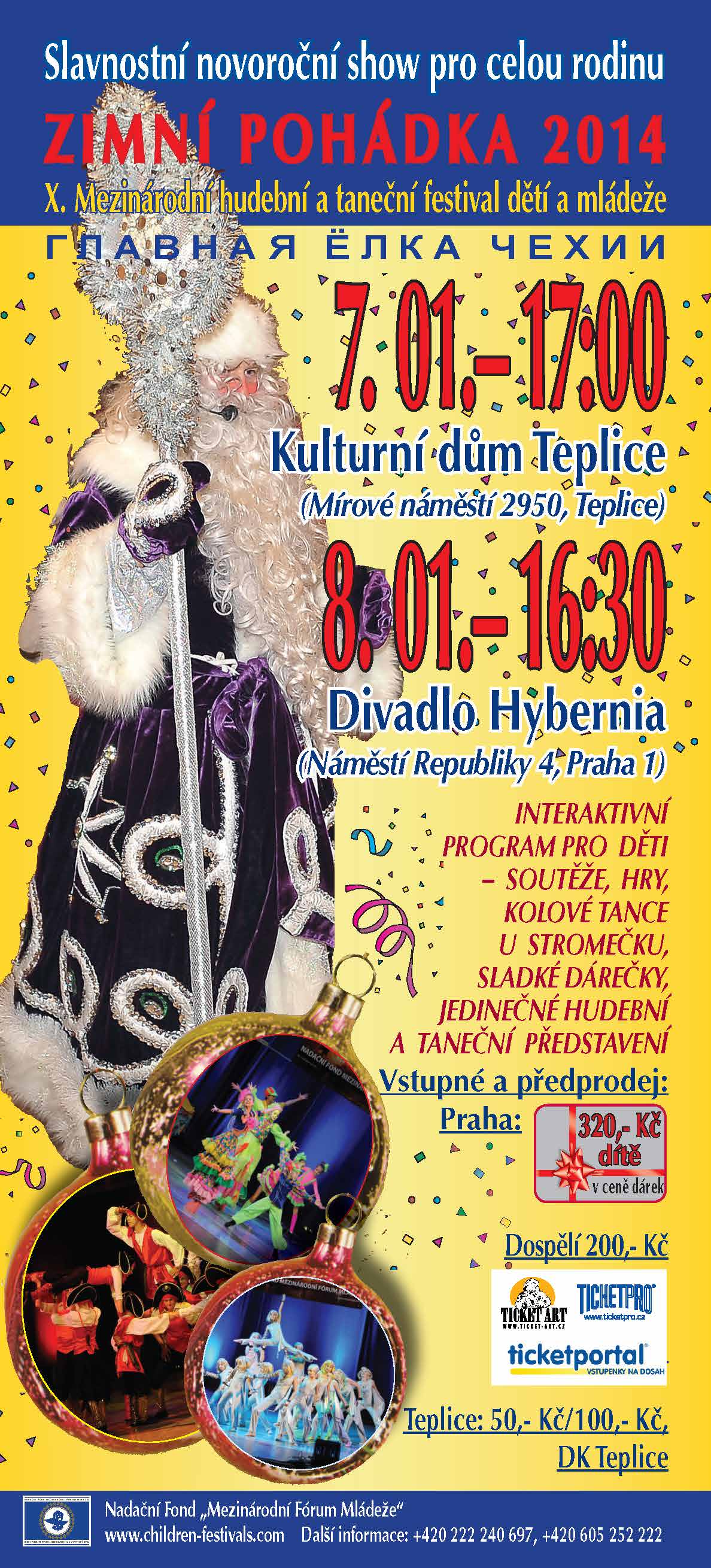 | Popis: | Galashow ZIMNÍ POHÁDKA 8. ledna 16:30– Divadlo Hybernia (Nám. Republiky 4, Praha 1) X. Mezinárodní hudební a taneční festival dětí a mládeže 16:30 - hry, zpěv a tance s pohádkovými postavami. 17:00 sváteční koncert - originální dějové nápady moderního a klasického tance, krásný sborový zpěv, pestrý líbivý folklor, svérázné a barevné kostýmy. * Jedinečná atmosféra svátku * Mistrovská vystoupení umělců z různých zemí. * Zimní pohádka – vždy očekávaný svátek pro děti i dospělé Cena vstupenek: 200,-Kč/dospělý, 320,-Kč-dítě (v ceně dětské vstupenky sladký dárek) Předprodej Praha: Ticket-art, Ticketportal, Ticketpro. Pořádá Nadační Fond "Mezinárodní Fórum Mládeže“ www.children-festivals.com Další informace: +420 222 240 697, +420 773 170 954 |