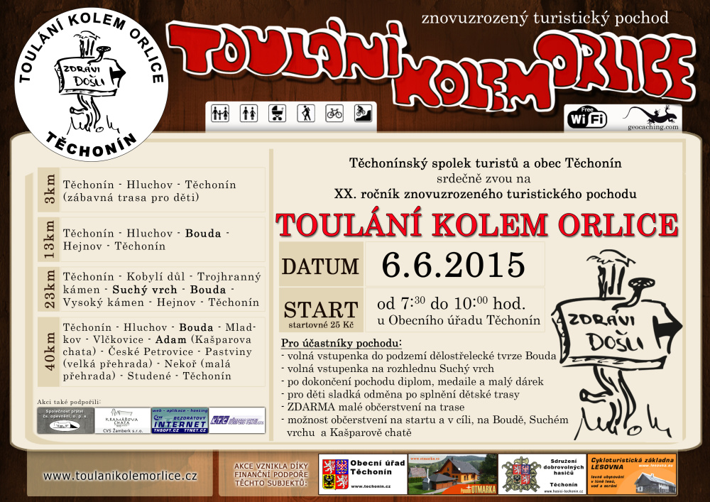 | Popis: | Trasy: 3 km - trasa kolem Těchonína „pro děti“ - se soutěžemi a kvízem 13 km - Těchonín - Bouda - Hejnov - Těchonín 23 km - Těchonín - Kobylí důl - Troj. kámen - Suchý vrch - Bouda - Vys. kámen - Těchonín 40 km - Těchonín - Bouda - Mladkov - Vlčkovice - Adam (Kašparova chata) - České Petrovice - Pastviny (Kraví skok, Velká přehrada) - Nekoř (Malá přehrada) - Studené - Těchonín Podmínky účasti: Dobrý zdravotní stav, pochod absolvuje každý na vlastní nebezpečí. Start: 7.30 – 10.00 hodin u Obecního úřadu v Těchoníně Cíl: do 18.00 hodin u Obecního úřadu v Těchoníně !!! V prostoru startu (cíle) FREE WIFI-hotspot (zdarma) !!! Startovné: jednotná cena 25,- Kč (v ceně je prohlídka Tvrze Bouda, při trase 25km vstup na rozhlednu Suchý vrch, malé občerstvení na trase, ceny pro děti a po dokončení pochodu diplom, medaile a malý dárek) Prezentace: na startu vyplněním startovního lístku Občerstvení: - na startu a v cíli pivo, limo, cukrovinky, klobásy, špekáčky - na trase zdarma teplý čaj a sušenka - na tvrzi Bouda pivo, limo, cukrovinky Odměny: - každému, kdo dokončí pochod, zaručujeme radost z dosaženého výkonu - každý, kdo projde stanovenými kontrolami, obdrží pamětní diplom a medaili - pro děti sladká odměna po splnění kvízu |