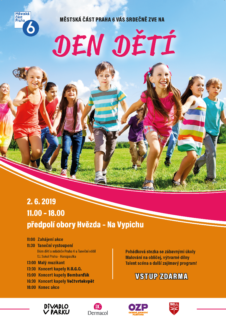 | Popis: | Srdečně vás zveme na tradiční akci MČ Praha 6 "Den dětí" ! Akce se koná v neděli 2.6. na předpolí obory Hvězda - Na Vypichu Čeká na vás bohatý zábavný program pro celou rodinu. Připravili jsme pro vás pohádková herní stanoviště, výtvarné dílny, malování na obličej, muzikantský workshop pro děti, taneční vystoupení, netradiční klaunské vystoupení, koncerty kapel BomBarďák, H.U.G.O. a Večtvrtekvpět, animační program, soutěže, ukázku hasičské techniky a práce, ukázku první pomoci a budeme také vydávat dětské řidičáky :-) Děkujeme místním volnočasovým a sportovním organizacím, že se zapojili do programu! Budete tak mít možnost vyzkoušet si různé sport a aktivity, jako např.volejbal, fotbal, sebeobranu, taichi, tančení, malování, gymnastiku a další! VSTUP ZDARMA! Těšíme na vás! |