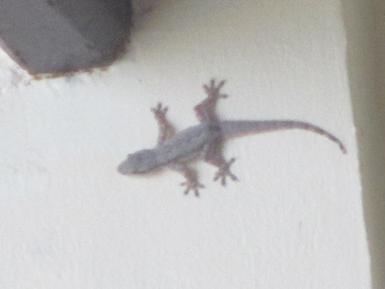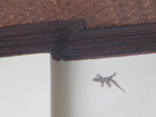 Pavouka jsem viděla jen jednoho, ale o tom za chvíli. O pár much (no fakt, přesně takové jako u nás, prostě klasické mouchy) se zřejmě postarali gekoni. Jsou nádherní, velmi plaší, nedají se dobře ani vyfotit, natož chytit, pohladit a hlavně jsou posvátní! Jejich přítomnost kdekoli v obydlí (nebo jak souhrnně nazvat jak apartmány, otevřené restaurace, tak i přístřešky místních) je skutečně nutná. I náš apartmán měl všude minimálně několikacentimetrové díry, aby všechno živé mohlo volně ven a zase dovnitř. Dokážu si představit tu otázku, protože mi byla několikrát položena. Ano, měli jsme v apartmánu gekona, zmizel za klimatizací a v noci asi "makal", protože mouchu či komára jsme neměli ani jednoho. Skoro jsme mohli natočit díl o domácích mazlíčcích - Bydlí s námi … gekon. Skoro, protože on o naši přítomnost skutečně nestál. A ostatní gekoni se zřejmě činili venku, občas se zahlédnout dali. Měli moc rádi večerní osvětlení. Představte si, co se stane, když na terase, chatě, chalupě atd. v létě večer rozsvítíte lampičku… Večeřééé!!!! Hmyz, tedy gekoni. Škoda, že nežijí u nás, asi by se našeho hmyzu přežrali!
