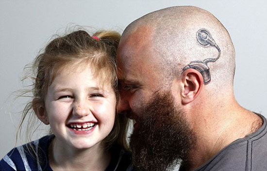 Svérázný tatínek Alistair Campbell z Nového Zéĺandu se rozhodl pomoci své šestileté dceři Charlottě, aby se necítila méněcenná. Holčička totiž kvůli ztrátě sluchu od čtyř let nosí ušní implantát, a proto si její tatínek rozhodl "pořídit také jeden" - na svoji hlavu si nechal vytetovat přesně takový, jako nosí jeho dcerka. Campbell nemá žádná jiná tetování a plánuje, že si časem nechá vlasy opět narůst, Nyní to ale, jak říká, "musel z lásky ke své dceři udělat".