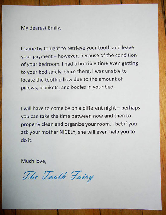 A někdy rodiče mohou Zoubkovou vílu využít k uklizení dětského pokoje. Jedna víla dětem nechala dopis: