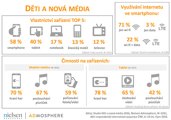 V dnešní době je již samozřejmostí, že děti velmi dobře ovládají moderní technologie a hojně je využívají i pro svoji zábavu. Jak na tom jsou konkrétně české děti ve věku 6-14 let, zjišťovala studie realizovaná společností Nielsen Admosphere v říjnu 2016 na vzorku 1031 dětí, ze které vybíráme nejzajímavější data.