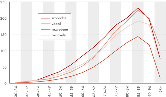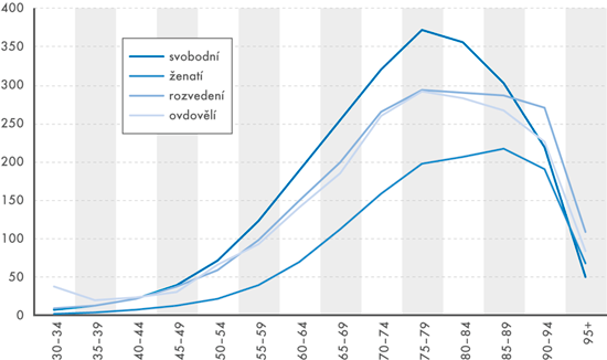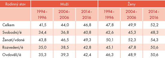 Ještě více se však za posledních dvacet let snížil rozdíl v úrovni úmrtnosti mezi ženatými a rozvedenými i mezi ženatými a ovdovělými. V případě rozvedených šlo o snížení rozdílu o více než čtvrtinu, u ovdovělých pak téměř o jednu pětinu. Z pohledu absolutních hodnot to znamenalo, že rozvedení muži, kteří v letech 2014 až 2016 dosáhli 30 let, by měli v průměru šanci žít ještě bezmála 43 let, o necelý půlrok déle než ovdovělí a o dva roky více než svobodní, avšak o 6,5 roku méně než muži žijící v manželství.