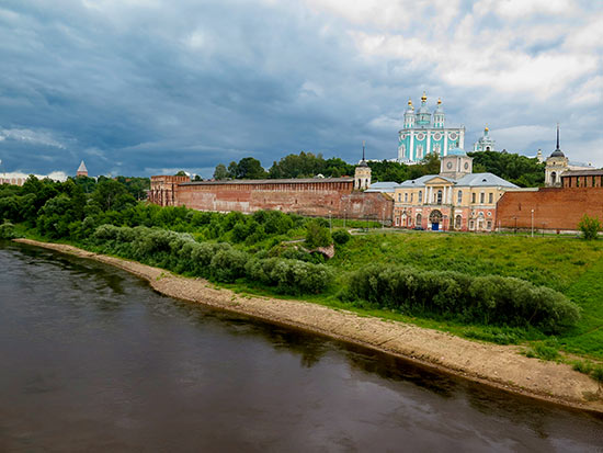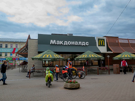 Padesát kilometrů do Smolensku jsme dojeli ani nevím jak. Vzpomínala jsem na poklidná běloruská městečka, na široké bulváry a cyklopruhy. To, co se dělo, cestou do centra Smolensku, byl pro nás jako zlý sen. Zvyk, že se v Bělorusku s cyklisty počítalo, alespoň pruhem na chodníku, jsme si tady museli hezky rychle zase odvyknout. Na silnici se pro hustý provoz skoro jet nedalo, ale na chodníku taky ne. Jestli nám v Bělorusku obrubníky připadaly vysoké, co jsme měli říkat tady!? Dvacet centimetrů nebylo nic, asi se tím mělo zabránit nájezdům aut. S vypětím všech hlavně psychických sil jsme se ocitli v centru města, které obývá asi 330 tisíc obyvatel. Přejeli jsme řeku Dněpr přes most, odkud je úžasný pohled na známou Smolenskou katedrálu, ale to je tak jediné, co mě ve městě upoutalo. Možná, až ho jednou opraví, to bude pěkné historické město, ale nyní je to děs. Zničení z provozu, z nájezdů na obrubníky, z objížděk rozkopaných ulic jsme k radosti dětí zapadli do místního McDonaldu.
