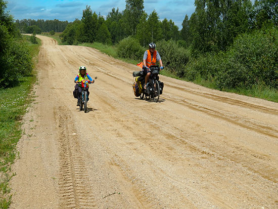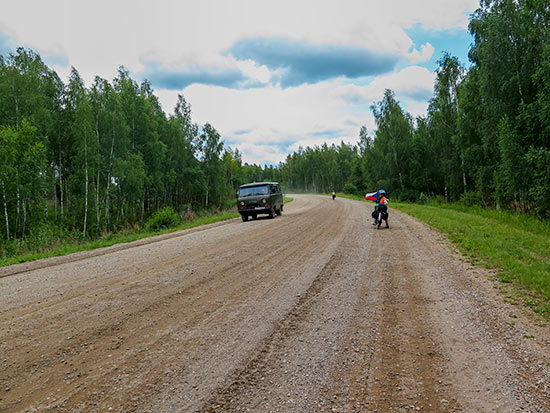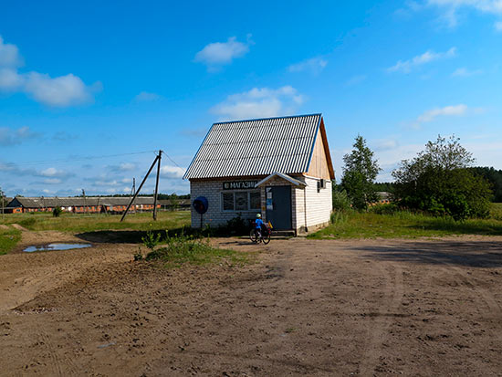 Nakonec asfalt vedl až do Korsiki, pak následovala zkratka lesem. Nastal trochu trapas. Došly nám ruble a bankomat se nacházel daleko, desítky kilometrů před námi. Bylo 13. července a Luděk s dětmi mi chtěli koupit něco k svátku. Žmoulali pár ušmudlaných rublů v ruce a přemýšleli, co za to nakoupí. Kartou tady platit nešlo, ostatně jako nikde. Na rozdíl od Běloruska. Jakási panímáma je pozorovala a nakonec to vyřešila za ně. Aniž by se dlouho rozmýšlela, vzala buřty, housky, křupky a sladkou limonádu, zaplatila prodavačce a Luďkovi vrazila do ruky v igelitovém pytlíku. "Tady máš!" Bylo nám trapně, ale paní měla radost. A když jsme opouštěli vesnici, náhoda tomu dala, že jsme projížděli zrovna kolem jejího domku. "Počkejte ještě!" zavolala na nás a zmizela v domě. Když se po chvíli objevila, v ruce držela igelitovou tašku plnou domácí zeleniny. Zelí, mrkev, brambory… "Vaříte si občas, že? Bude se vám to hodit?" strachovala se ještě. Jakpak by ne. "Moc vám děkujeme!"
