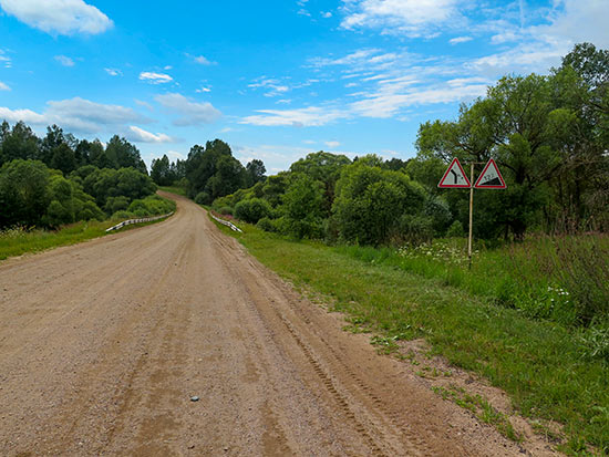 Abychom se vyhnuli hlavním silnicím, jedeme po těch nejmenších silničkách. Ve Smolensku jsme sehnali poměrně pěkné a podrobné mapy Smolenské a Brjanské oblasti. Dá se podle nich i celkem slušně odhadnout, kde skončí asfalt. A když nevíme, zeptáme se místních. Bylo poledne a oni měli zrovna příjemnou siestu u nakrájených salámů, sýrů a zeleniny. "Pojďte ochutnat a popít vodku!" pobízejí nás. "Prosím vás, tahle silnice směrem na Korsiki, bude i dál asfaltová?" (ano, ta vesnice se takhle jmenovala a bylo to do ní cca 10 kilometrů). Dotazem jsme je zjevně rozhodili. Někdo tvrdil, že ano, jiný že asfalt po dvou kilometrech skončí, další vůbec netušil, protože tam nikdy nebyl. Není se co divit. Krajina je kolem dokola pořád stejná. Ne jako u nás. Tady ujedete deset, dvacet, padesát kilometrů a obrázek je stále stejný. Lesy, louky, vesničky s dřevěnými domky. Turistika tady opravdu v takové formě jako u nás, nepokvete. Kam by se tady turista vydával. To vysvětluje i nízký, skoro nulový provoz. Nikdo nemá potřebu zbytečně trajdat. Jede se jen, když je to nutné. Aut jezdí opravdu málo. A když už něco jede, tak bohužel ke zklamání našeho Víti, jde o značně zastaralý model.