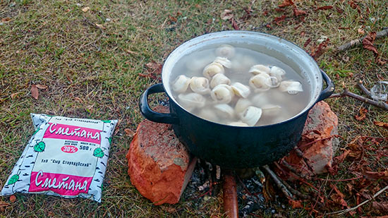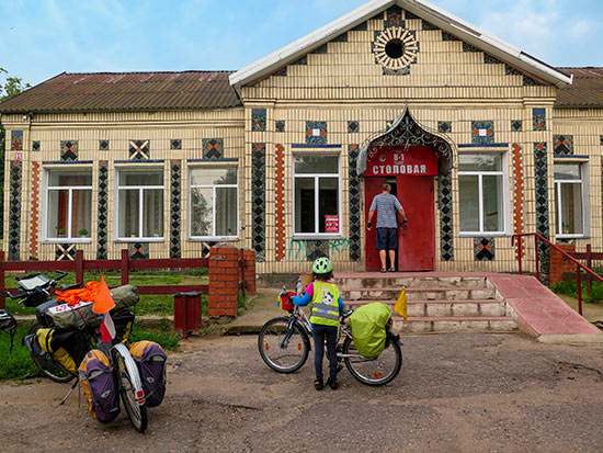 Ve městech jsou možnosti stravování podstatně lepší než na vesnici. Nenápadná budova často ukrývá jídelnu s nabídkou teplých jídel. A všude mají čepovaný kvas. A když náhodou přes žádné město nejedeme, koupíme si v obchůdku mražené pelmeně a uvaříme si je se smetanou. Lahůdka! Ruská kuchyně nám chutná. Boršč, studený boršč, okroška, palačinky, pelmeně, hodně těstovin…