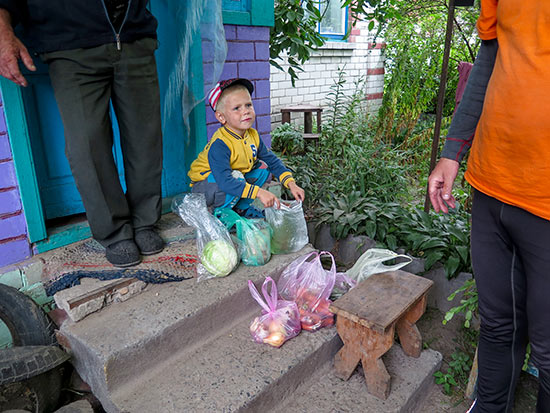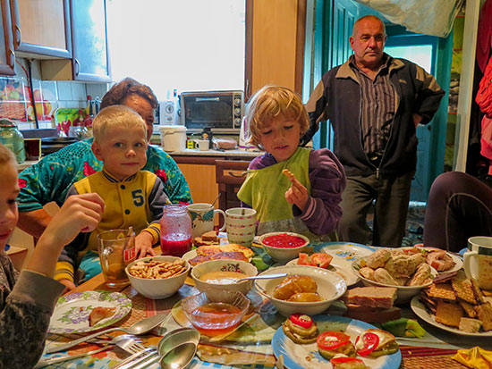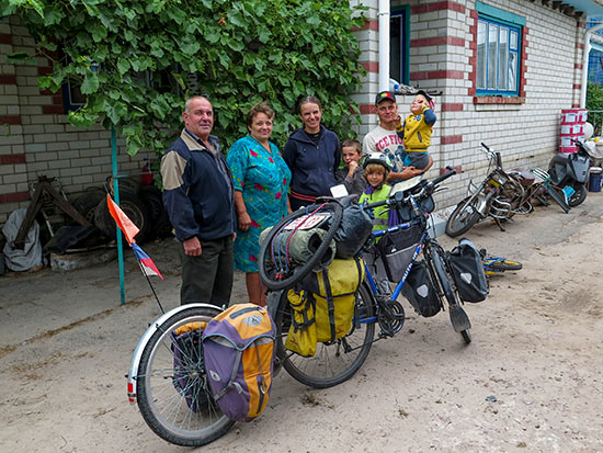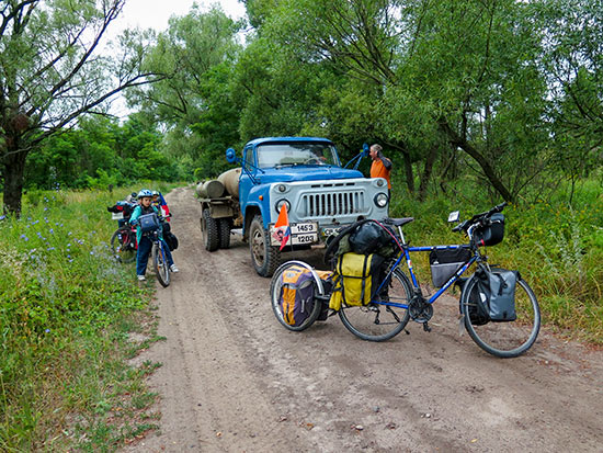 Čekala nás další bezvadná zkratka. Osmnáct kilometrů pískem. Byl naštěstí po včerejším dešti nasáklý vodou a uježděný, takže se celkem i dalo jet. Nákladní auto nás překvapilo, ale starší řidič byl možná překvapený ještě víc. Zastavil a nevěřil svým očím. "Kde jste se tady vzali? A kam jedete? Jak je daleko do vesnice se ptáte? To máte ještě sedm kilometrů." Když jsme se tam dodrkotali, pochopili jsme, že přesně udaná vzdálenost nebyla náhoda. Modrý náklaďáček stál zaparkovaný hned vedle domu a tam už na nás byli připraveni. "Zachadítě v gósti!" Nebylo ještě ani poledne a otázka, co tomu řekne manželka, byla zbytečná. Stála vedle něho a zvala nás se stejnou samozřejmostí a srdečností. Viděla nás poprvé v životě, poprvé v životě dost možná i v této bezvýznamné vesničce viděli i nějakého turistu. Nikam jsme nespěchali a vše se událo tak automaticky a přirozeně, jako bychom se jen dívali na film. Nejprve jsme museli na exkurzi po zahradě. Paní domu, ve kterém žili společně se synem, nevěstou a jejich malým synkem, nás pyšně provázela po svém hospodářství, které se snad ani zahrada nedalo nazvat. Na dvou hektarech rostlo vše, co je v kuchyni potřeba. A zvířat měli jak v ZOO. Tak jen namátkou, co si pamatuji: dvě prasata, dvě krávy, koza, pes, kočka, husy, kachny a slepice. Pak jsme byli vyzváni, abychom vkročili dovnitř domu. Zde již nachystám plný stůl, až oči přecházely. Vše zaručeně v domácí kvalitě. I tady se řeč, kromě jiného, stočila na Černobyl. "Tři měsíce jsem tam pomáhal likvidovat havárii. Prostě přišel vojenský rozkaz shora. Zaplacené to bylo slušně." Důchodce na Ukrajině by s důchodem 1200 hřiven nevyžil, rozvážením nafty do traktorů si pán přivydělá další 3 - 4 tisíce, takže se mají se dobře, což rádi slyšíme a s chutí ochutnáváme jednu jejich dobrotu za druhou.