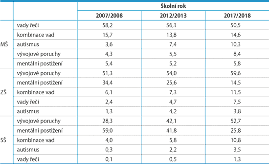 I když se podíl dětí se speciálními vzdělávacími potřebami v mateřských a základních školách časem příliš nemění, jejich absolutní počet se vzhledem k aktuálně silným ročníkům školkových a školních dětí zvyšuje. Za posledních deset let jich bylo výrazně více integrováno do běžných mateřských, základních i středních škol. A mění se také struktura postižení, kvůli kterým děti speciální přístup ve škole potřebují.
