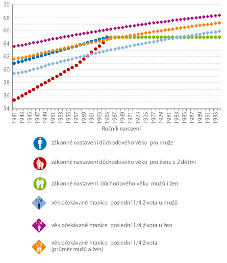 Vzhledem k odlišné celkové střední délce života mužů a žen ale jednotně nastavený věk odchodu do důchodu nebude znamenat pro muže a pro ženy také shodný očekávaný podíl zbývající délky života při dosažení důchodového věku. Stejně jako v minulosti by měly i nadále relativně větší část života strávit v důchodovém věku ženy. Dosavadní legislativní opatření měnící důchodový věk přispěla k redukci tohoto rozdílu. Z výsledků dále vyplývá, že na straně mužů se uvedený podíl v čase měnil jen nepatrně. Postupné zvyšování věku nároku na starobní důchod v podstatě korespondovalo s rostoucí střední délkou života napříč generacemi. Muži dosahující důchodového věku měli v průměru před sebou zhruba 23 % života. U žen tomu bylo jinak. Očekávaný podíl zbývající délky života žen při dosažení důchodového věku měl díky rychlejšímu tempu růstu důchodového věku (ke kterému dochází od generace 1937 a od generace 1956 je zrychlen) klesající trend. U žen z válečných generací dosahoval 33 %, u generací žen z poloviny 50. let (právě dosahujících důchodového věku) je odhadován na necelých 30 %. Zafixování hranice důchodového věku na 65 let (pro všechny od generace 1972, pro muže a ženy s žádným a jedním vychovaným dítětem od generace 1965, pro ženy s dvěma vychovanými dětmi od generace 1966) pak při pokračujícím příznivém trendu úmrtnosti povede k růstu očekávaného podílu života v důchodovém věku u mužů i u žen, s mírným sblížením tohoto podílu mezi pohlavími. Zatímco mužům z první posuzované generace 1965 by mělo při dosažení věku 65 let zbývat v průměru 23 % života, těm narozeným v roce 1994 pak téměř 26 %. Ženy narozené v polovině 60. let minulého století by měly mít při dosažení věku 65 let před sebou ještě 26 % života, ženy o 29 let mladší již 28 %.