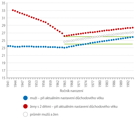 Poznámka: Důchodový věk žen až po generaci 1971 závisí na počtu vychovaných dětí. V grafu je pro jednoduchost uvažována je nejčetnější skupina žen - ženy se dvěma dětmi.
