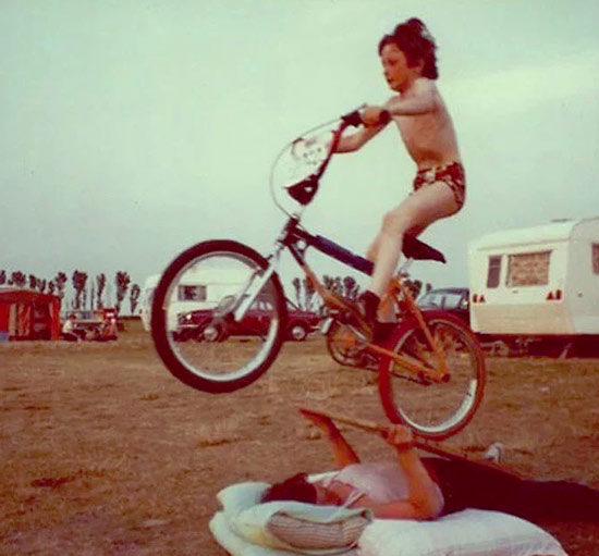 Musel jsem vyzkoušet své nové BMX kolo. Maminka úplně dole. 80. léta.