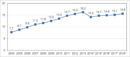 Z grafu číslo 1 je patrné, že od roku 2004 dochází každoročně ke zvýšení počtu počítačů, přičemž mezi lety 2004 a 2013 vzrostl počet počítačů ve školách o 8,5 kusu na hodnotu 16,2 při přepočtu na 100 žáků. Dále lze pozorovat pokles mezi roky 2013 a 2014, tento pokles ovšem neznačí snížení reálného počtu počítačů ve školách, nýbrž změnu metodiky sběru dat.
