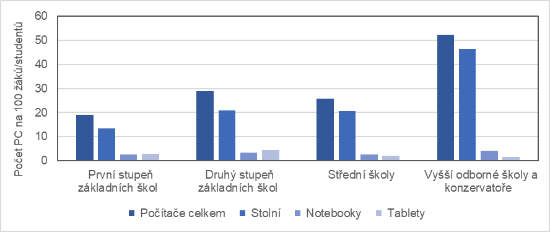 Z pohledu jednotlivých stupňů škol jsou počítači nejlépe vybaveny vyšší odborné školy, kde v roce 2018 měli 52,2 počítače na 100 studentů. Na 1. stupni základních škol bylo 19,1 počítače na 100 žáků, na 2. stupni 28,8 počítače a na středních školách 25,7 počítače na 100 studentů. V těchto počtech se patrně odráží to, že na 1. stupni základních škol žáci počítač ve výuce ještě tolik nepotřebují a předmět informatika je intenzivněji vyučován především na druhém stupni základních škol, čemuž odpovídají i vyšší počty počítačů, které jsou žákům na tomto stupni dostupné. Počet počítačů na 100 studentů středních škol pak zřejmě snižuje fakt, že mezi střední školy jsou na jedné straně sice zařazena gymnázia či odborné střední školy, kde jsou počítače intenzivně využívány, na druhé straně však také odborná učiliště, kdy na některých oborech nejsou pro výuku počítače takřka potřeba.