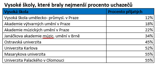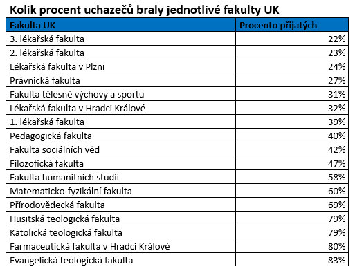 V rámci Univerzity Karlovy bylo letos vedle zmíněných lékařských fakult nejtěžší dostat se na práva (uspělo 27 procent přihlášených) a FTVS (31 procent). Někoho může překvapit, že u některých jiných univerzit figurovaly na prvních místech tohoto žebříčku pedagogické fakulty. Například na Jihočeské univerzitě (60 procent přijatých na PedF, 73 procent na celou univerzitu). Nebo v Hradci Králové (53 procent PedF, 67 procent celá univerzita).