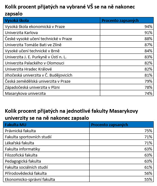 Analýza se rovněž zabývala tím, kolik procent přijatých na danou školu se na ni nakonec také zapsalo. Tento faktor může ukazovat preference při výběru univerzit a prestižnost jednotlivých škol. Nejlépe si vedla Vysoká škola ekonomická v Praze (94 procent). Univerzita Karlova (91 procent) v tomto ohledu porazila svou tradiční rivalku Masarykovu univerzitu (74 %). To potvrzuje i další statistika: na UK i na MU zároveň se letos dostalo 782 přihlášených. Z nich se ve finále zapsalo pouze na UK 500 studentů a pouze na MU 167 studentů.
