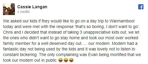 Rodičovství ve 21. století je těžká disciplína. Se zábavou, kterou dětem poskytují displeje, se jen těžko něco může měřit. Když s australskými rodiči Cassie a Chrisem Langanovými odmítly jejich děti jet na výlet, vzali místo nich k moři modem. Podle fotek to byl skvělý výlet!