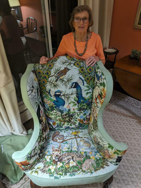 Moje babička dokončila v 86 letech vyšívané křeslo. Pracovala na něm 25 let.