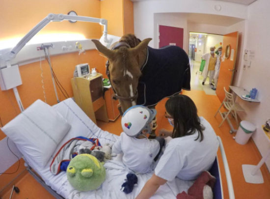 Krásný 15letý hřebec Peyo ve francouzské nemocnici Techer v Calais často na pokojích navštěvuje, utěšuje a uklidňuje malé i velké pacienty.