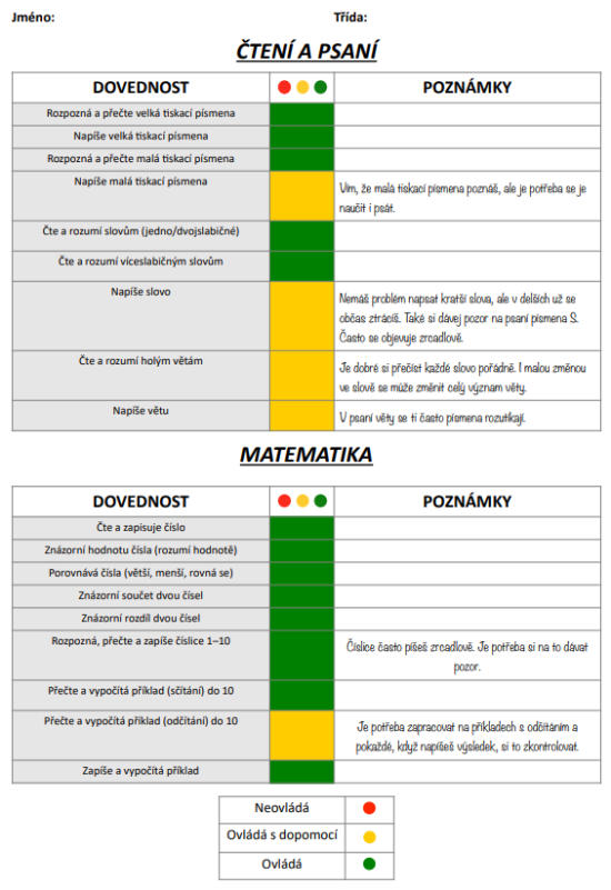 Na prvním "vysvědčení" jsou ve sloupci vypsané dovednosti, na kterých během pololetí děti ve škole pracovaly. To, jak si je žák osvojil, vyjadřuje barva v druhém sloupci: zelená, žlutá, nebo červená. Poznámky učitele a jeho postřehy k dané činnosti si žák může případně přečíst ve třetím sloupci.