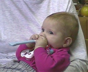 A protože oslavil minulý pátek své půlroční narozeniny, rozšířil se mu tento víkend jídelníček i o šťávičku z jablka. Docela mu to chutnalo, ale zajímavější, než nová chuť, byla pro něj lžička, se kterou ho krmíme.... Ani druhá lžička do jeho ručičky moc nepomohla, cpal si je do pusy obě současně.