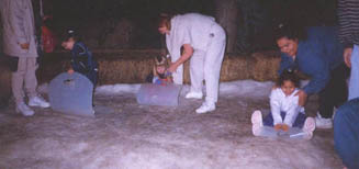 ![]() Deti na snehu ve Wild animal park v San Diegu. Jezdi se ne na opravdovych sankach, ale na takovem kusu umele hmoty s dirkou pro ruce. Kdyz se vyboura, tak to neboli. Na tomhle malem kopecku pro male to jde, ale na velkem pro vetsi deti je fronta na hodinu pro 10 minut jezdeni.... |