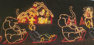 ![]() Svetla ve Wild animal parku. Odrazeji se ve vode jednoho z rybniku. Sloni jsou "animovani. Jedou jeden po druhem. |