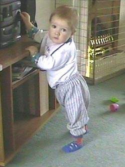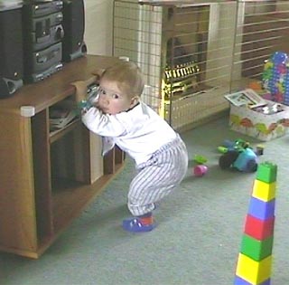 Jeden týden tedy zjišťoval, jak se leze, další týden si rezervoval na výuku vstávání. Zpočátku byl na čtyřech, vyrovnal kolínka a zadeček mu koukal do vzduchu. Pak se zkusil rukama chytit příček v postýlce nebo jiného kusu nábytku a zadeček mu šel nahoru lépe. To byla docela zvláštní pozice (zalomený do pravého úhlu), ještě při tom zkoušel pérovat v kolenou. No a nechybělo mnoho, aby se vytáhnul rukama ještě výš…. Strašně se mu to zalíbilo a od té doby se stále staví do stoje. Už mu jen stačí aby se lehce přidržel třeba zdi a hned stojí.