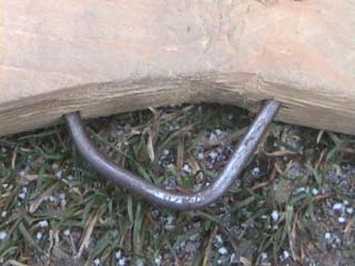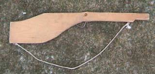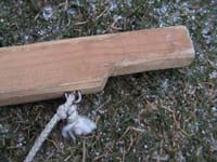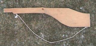 Snad nejnádhernější detail z celé hračky. Křivě ohnutý hřebík osmdesátka vytváří překrásnou spoušť. Za povšimnutí ale stojí i stylové zpracování dřeva pomocí technologie rašplování. Místo ochranného nátěru je dobré nechat hračku venku zmoknout.