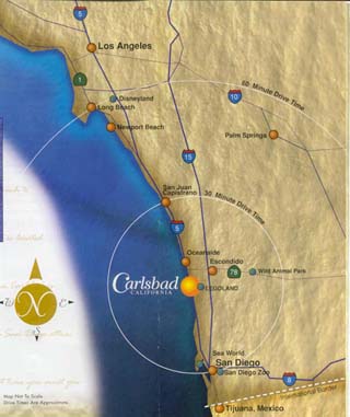Mestecko, spis vesnicka Carlsbad, melo v dobe, kdy prislo ke svemu jmenu kolem 300 obyvatel. Dnes ma, i kdyz to tak na prvni pohled nevypada 73 tisic obyvatel. A kazdy mesic jich nekolk set pribyva. Ovsem nenechte se tim cislem oklamat. Jeho stred porad vypada jako malicke lazenske mestecko. Jeho "downtown" projdete za par minut. Ten velky pocet obyvatel zije rozhazen po kopcich, v malych uzavrenych komunitach s bazeny a parkovou upravou jako je ta nase.
