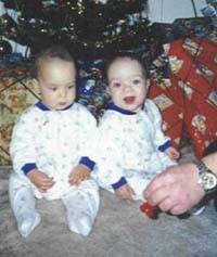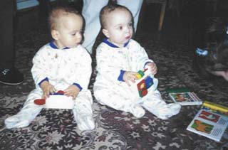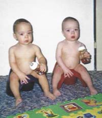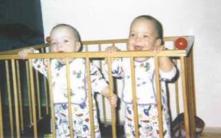 Ondrášek opravdu začal chodit v ukončeném osmém měsíci, v době, kdy Lukášek ještě lezl. Lezl ovšem poměrně rychle a "výchova" a "dovolená" - tedy mateřská, se zvrhla v maratón. Pouhé čtyři místnosti a než je oběhnete s očima navrch hlavy, protože:"Mně NĚKDE řve dítě" - a velice dobře odmalička rozlišíte, které, to je tedy pocit…..Vyzkoušeli jsme také ohrádku, ale jedno dítě chodící podél ohrádky a jedno ve stejném prostoru lezoucí jaksi také nebylo zrovna nic ideálního. Ondrášek přinejmenším vždycky bráškovi stihl něco přišlápnout, nedošlo-li k nejhoršímu a to byl moment, kdy přes bráchu prostě upadl. Když jsem je rozdělila - začal řev. Nakonec tatínek s geniálností sobě vlastní umístil ohrádku do průchodu mezi kuchyní a obývákem, takže už jsem neobíhala místnosti čtyři, nýbrž pouze dvě - kuchyň a chodbu. Bohužel, Ondrášek časem pojal ohrádku jako ideální oporu pro své vycházky a případné lomcování a omlátil kompletně všechny rohy okolní zdi (a ty přihlouplé červené koule v rozích krásně barví). No nic, tatínek prý hrdině "ČASEM" všechno dá do pořádku….. Také tak milujete slovo "ČASEM"?