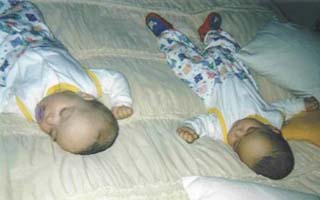 Tak jsme je alespoň na odpolední spánek rozdělili. Lukášek chodí někdy spinkat s babičkou (babí pracuje brzy ráno, tak jí "dáchaneček" přijde vhod), Ondra se mnou, případně s tatínkem. Usínají odpoledne oba docela bleskově. Když je dobrá konstelace hvězd a mně se povede "utrhnout" trochu času, abych dohnala spánkový deficit, vydržíme spinkat s Ondráškem i tři hodiny. Odejdu-li, když usne, je ta doba o malinko kratší, ale přeci jen báááááječná.