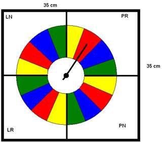 2) Rozhodčí roztočí hodiny a přečte značku, kde se ručička ustálila. LN = levá noha, LR = levá ruka, PN = pravá noha, PR = pravá ruka. V našem případě tedy: pravá ruka červená.