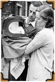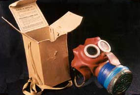 ![]() Této modročervené plynové masce pro děti se říkalo Mikimauz, protože dítě prý v ní vypadalo jako jeho oblíbené kreslené postavičky.