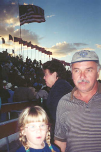 Po tom, co nám vyložili historii všech vlajek, které kdy vlády nad Kalifornii a krásné dívky na koních je rozevlátě pronesly arénou (jestlipak víte, že mimo těch známých jako je anglická a mexická, byla také jedna ruská?), jsme všichni vzdali čest hvězdám a pruhům: Vlajka byla neuvěřitelné velikosti. Všichni v aréně vstali. Hráli nám k tomu píseň o praporu a pak přidali hymnu. Všichni zpívali a měli ruku na srdci.