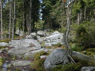 Už v noci jsme tušili, že přestalo pršet, ale ráno bylo neuvěřitelné.Modro, slunce!Děti nepřestávali jásat, čekají nás Bludné skály v Polsku,to přece zní lákavě.Broumovské stěny jsme museli objet na přechod v Božanově a pak už do polského Kalowa.Opustili jsme myšlenku mokré varianty - dojet až k Bludným skalám- a zaparkovali jsme v Kalowě.Okruh pouhých 12km (z něhož pětikilometrový závěr bude po silnici) jsme odhadovali na chvíli po poledni.Vesele jsme vyrazili od rozcestníku v 10,00 hod.Už vstup do lesa nás měl varovat, ale nevaroval.Po deštích bylo všude mnoho vody, přesto rozcestník hlásil 1 a 1/3 hod.Pokaždé, když jsme vystoupali a potůčky na chvíli přestali provázet naše kroky, doufali jsme, že dál už bude sucho.Ó jak jsme se mýlili, jak jsme klesali, potůčky jakoby vyskakovali z cesty, jak čertíci .Cesta korytem potoku, a to jsme nezabloudili, ale šli stále po červené, byla ještě stále legrace.Po té přišel vrcholový úsek, leč opět plný vody.Ale překvapením nebyl konec, dalším úsekem jsme doslova proskákali.To už jsem se koukala do mapy a nevěřila.Děti byly skvělé, stále v dobré náladě, šly přece kolem skal, a to je to co je baví. Konečně Bludné skály! Vybojovali jsme si je a stály za to.Cestou zpátky jsme viděli několik vodopádů a pak už se těšili na oběd v čase odpolední svačiny.