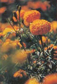 Ve slovníku jsou překládány obvykle jako měsíček...Ale nejsou to měsíčky jako v babiččině zahrádce u nás. Jsou to spíš plnokvěté "afrikány", jak jim říkala moje maminka. Někdy zdobívají na podzim i naše hřbitovy. Květiny z rodiny TAGETES. (Mexičané jim říkají zempasuchil).
