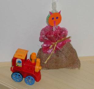 "výroba" je jednoduchá - potřebujete kulaté lízátko (na velikosti záleží jen vzhledem k obdarovanému), barevný papír nebo zbytky lepící fólie v různých barvách.Vystřihneme kolečko dle velikosti lízátka a ostatní části obličeje, ty nalepíme na kolečko a to potom na obal lízátka.Můžete vylepšit ještě třeba přilepením čertovských kudrnek z vlny apod.