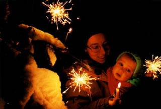 V Praze máme svůj vánoční stromek, který nám roste v Krčském lese. Vždycky si ho ozdobíme svíčkami, prskavkami, papírovými řetězy i jinými ozdůbkami. Ovšem v Dubenkách byly stromky tak krásně zapadané sněhem, že nám přišlo líto je hyzdit ozdobami a jenom jsme si je osvětlili. Verunce se světýlka moc a moc líbila a vydržela se na ně dívat celou půlhodinu, dokud svíčky nedohořely a všechny prskavky se nevyprskaly.