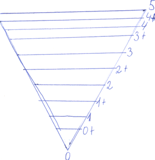 Nejlepe je si predstavit znalosti ciziho jazyka jako takovy stejnoramenny trojuhelnik (pyramidu) postavenou na hlave. Tam, kde je ta spicka, je 0. Zacatek uceni. Horni linie je 5.