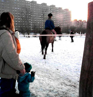 Úplně nakonec nám teta ukázala koně. Na koních jezdily děti, ale už veliké děti, ne jako my. Míša chtěl jezdit taky, tak pořád chodil do ohrady a teta Saša ho pořád musela chytat a tahat nazpátek.