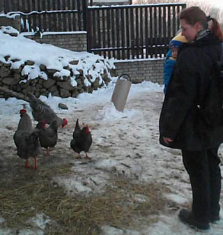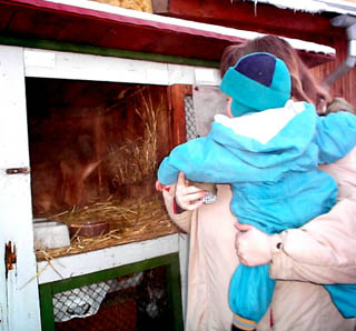 Nejdřív jsme šli do velikánské ohrady, kde bylo móóc pipinek. Teda, ony ty pipinky vlastně nejsou jen tak obyčejné pipinky - jsou to slepice, kohouti, husy a kačenky. A taky tam stály dřevěné domečky a v nich... Teda, to mi asi nebudete věřit. Nevím, jestli vám to mám vůbec říct. Já se hrozně lekla. A vy byste se mohli polekat taky... No, tak to teda povím. Hned v prvním domečku byl zavřený... velikánský, černohnědý... čert!!! Hůůů!!! Až když jsem slyšela tetu Kristýnu, jak si s Robíkem říkají „méé“, mi došlo, že to není čert, ale koza. Teda kozel, jak mi řekla máma. Pak už jsem se ho nebála a dokonce jsem si zamilovala bílé kozičky, které byly ve vedlejším domečku. Byly hrozně zvědavé, skoro jako my, tak se na nás šly podívat a máma mě dala tak, abychom si s jednou z nich mohly koukat z očí do očí... a protože ta koza měla oči moc hezké a líbila se mi, tak jsem jí rychle dala pusinku na čumáček :-) A v tom domečku taky byly ovečky. Velké i malinké. Jedna malinká se narodila teprve před týdnem a představte si, už chodí. Míša s Robíkem taky chodí, ale já ne. Co kdyby mě potom přestala máma nosit? A pak byl za ohrádkou ještě jeden domeček, a v něm byl velký hnědý chlupatý králík. Míša mu pořád dělal malá malá a my ostatní ho skoro neviděli. Ale to nevadí, protože já mám doma úplně stejného, ale plyšového.