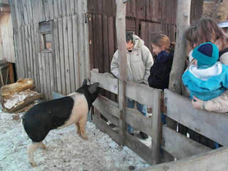 Já mám prasátko hrozně ráda, v mojí knížce je krásně růžové a usměvavé a máma mi ukázala, jak chrochtá. A já potom večer ukazovala tátovi, že prasátko dělá „chrrr chrr“ a táta si myslel, že se dusím :-( Tak jsem na živé prasátko byla moc zvědavá, jestli opravdu chrochtá jako máma, když táta moje chrochtání hned nepoznal. Teda, já byla zklamaná! Jednak to prasátku nebylo růžové, ale černé. Navíc bylo strašně velikánské. A hlavně se snažilo mojí mámu sníst! To se přece nesmí!!! Jak jsme stály u výběhu, tak se na ní najednou přes plot vrhlo a začalo žužlat máminu tašku a bundu. Teta ze dvora říkala, že určitě poznalo, že má pro mne máma v tašce zeleninkový salát a chtělo taky papat zeleninu. Ale já jí stejně nevěřila. Kdybychom u plotu stály ještě chvíli, určitě by mámu snědlo celou.