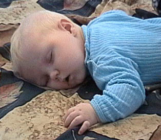 Realita u nás doma je úplně jiná. Tomášek nespí. Nepotřebuje to. Ani po narození nespal "předepsaný" celý den s výjimkou kojení. Od třetího měsíce věku spal během dne třikrát maximálně hodinu, večer usínal mezi 22. a 24. hodinou a ráno byl čilý od osmi. Děs, běs, hrůza. Třetí a čtvrtý Tomáškův měsíc považuju za jedno z nejšílenějších období mého života. Tomášek opravdu spal velmi málo a když nespal, řval. Nebrečel pouze v okamžiku, kdy jsem ho chovala, nosila, kojila, nebo si s ním hrála (to ale zabíralo jen někdy). K tomu se stále budil a budí každé tři hodiny na kojení, takže jsem byla nevyspaná k smrti - teď to sice co do naspaného času není lepší, ale tělo si už zvyklo :o)