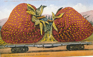 O jahodách a jejich sbírání jsem vám už také psala. Jsou symbolem sladkosti požehnání Kalifornie. Jsou opravdu neuvěřitelně velké, i když ta pohlednice z přelomu století přece jen trochu přehání.